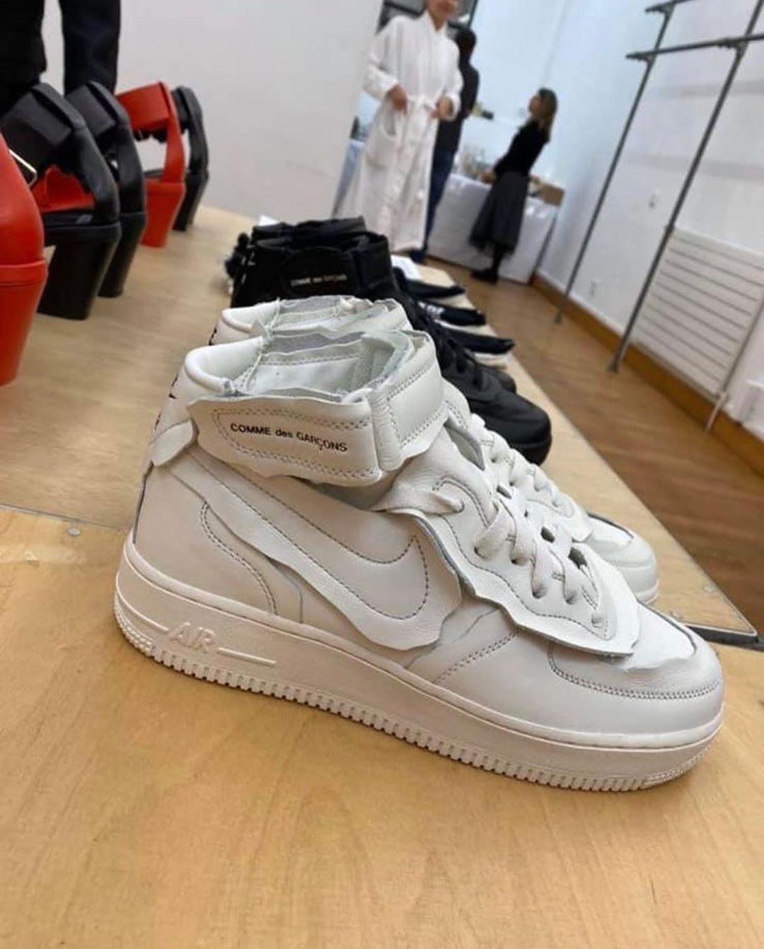 Modern Notoriety on X The COMME des GARCONS x Nike Air Force 1 Mid features excess material around the Swoosh laces toe box and ankle strap giving the pair a deconstructed look Very well made.