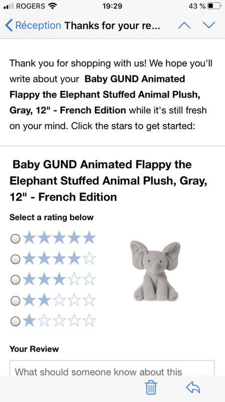 GUND Flappy L ELEPHANT Peluche Interactive pour Bebe Bouge Parle et Chante en Francais pour l Eveil de Votre Enfant Peluche Elephant Taille 30 cm 6054176 Jouet Bebe 10 Mois Very well made.