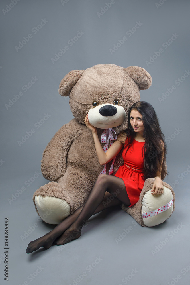 Young beautiful girl in red dress with big teddy bear soft toy happy smiling and playing on grey background Stock Photo Adobe Stock Very well made.