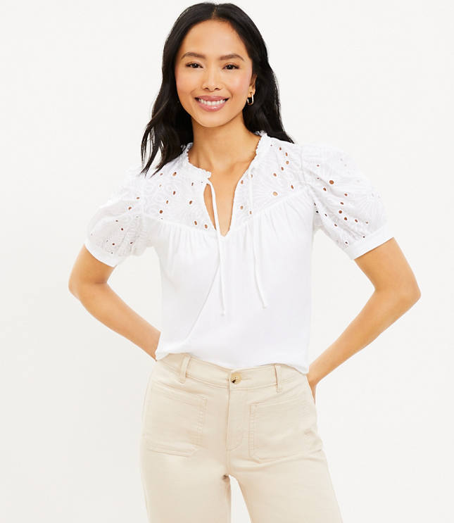 Petite Eyelet Tie Neck Puff Sleeve Mixed Media Top Very well made.
