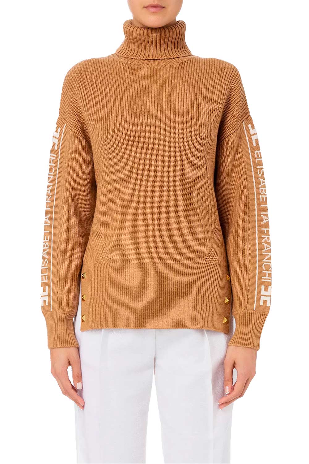 ELISABETTA FRANCHI Maglione in viscosa con logo jacquard Cammello Maglia Elisabetta Franchi MK65S online su GIGLIO.COM Very well made.