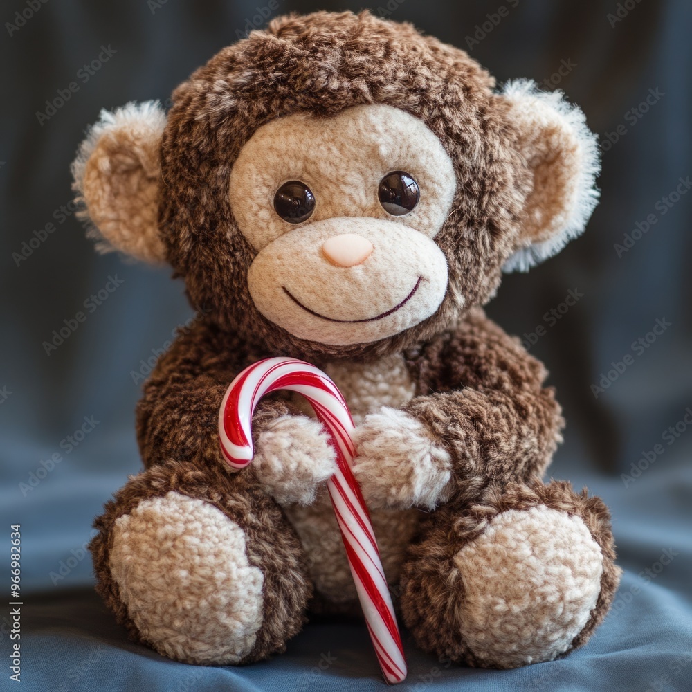 Photo Art Print A brown plush monkey toy sits on a blue background holding a candy cane in its hands PuiZera Very well made.