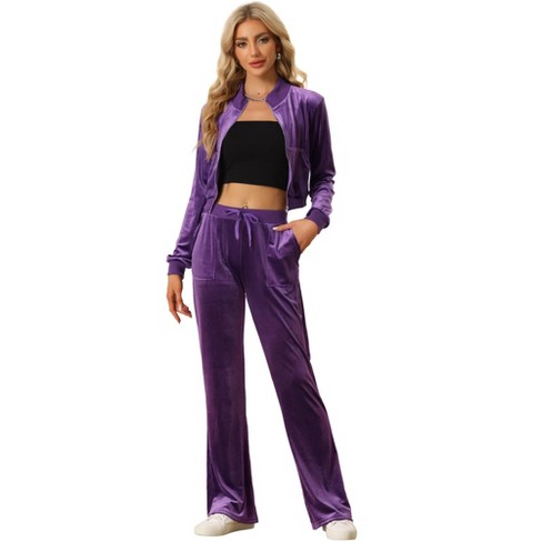 Allegra K Women s Velour Crop Zip Jacket Flare Pants Two Pieces Tracksuit Set Purple Small Very well made.