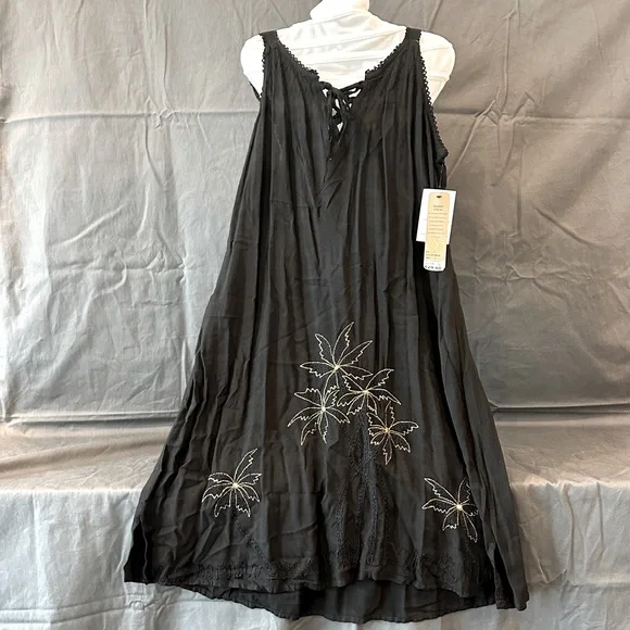 RAYA SUN Dress Cover Up Semi Sheer Black with Green Embroidered Design Size Med Very well made.