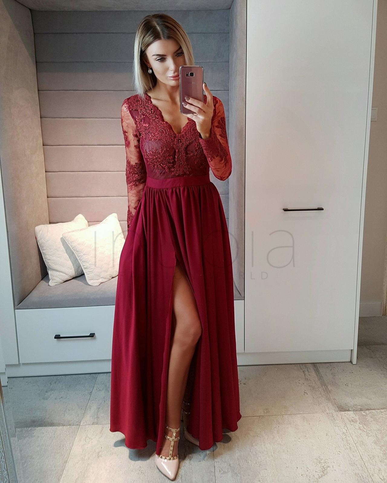 Long Sleeves Burgundy Lace Prom Dresses Long Sleeves Wine Red V Neck Formal Evening Dresses Very well made.