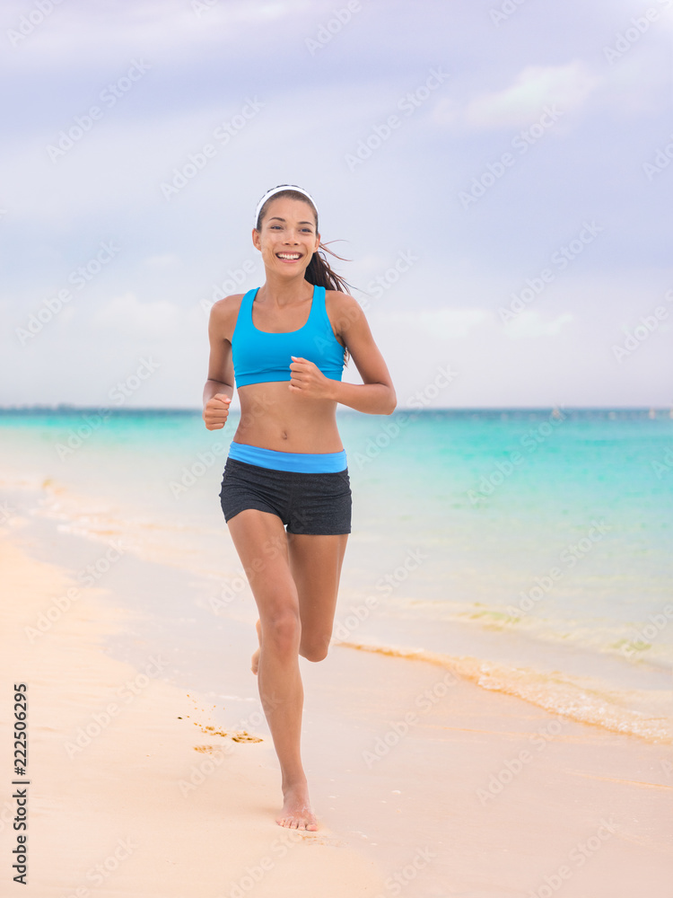 Active lifestyle young woman jogging on beach. Running barefoot on sand in Hawaii vacation travel Asian girl running on tropical holiday in blue activewear outfit. Stock Adobe Stock Very well made.