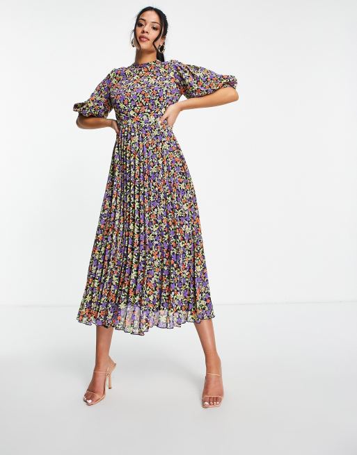 ASOS DESIGN Tall Hochgeschlossenes plissiertes Midikleid mit Puffarmeln und buntem Blumenmuster Very well made.