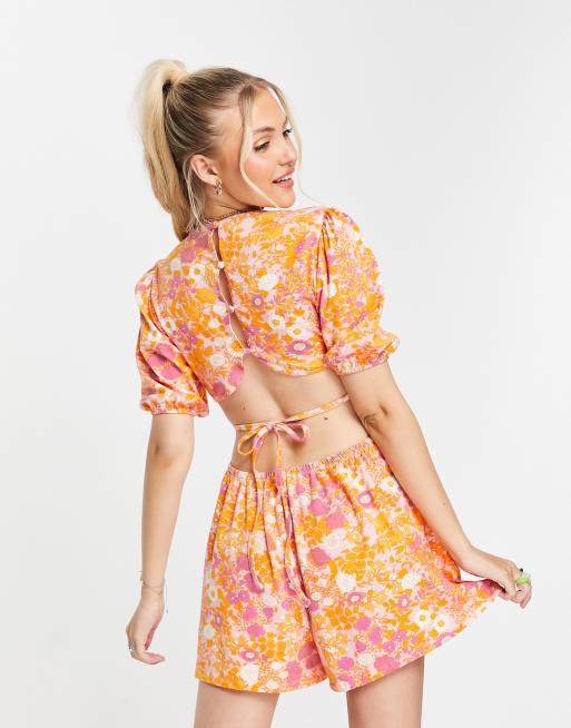 ASOS DESIGN Playsuit mit Blumenmuster in Retro Rosa Ring Detail und Puffarmeln ASOS Very well made.