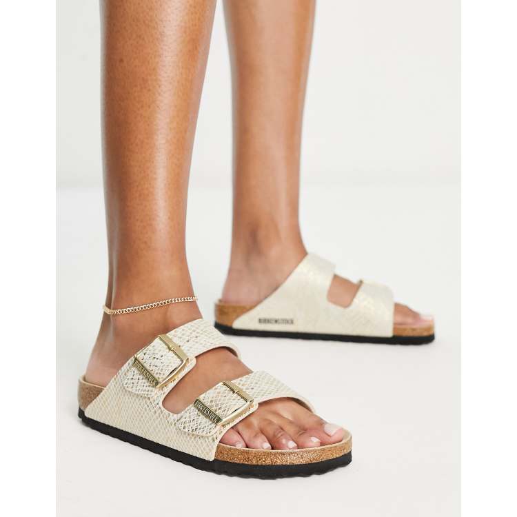 Birkenstock Arizona Flache glanzende Sandalen in EierschalenweiB mit Schlangenmuster ASOS Very well made.
